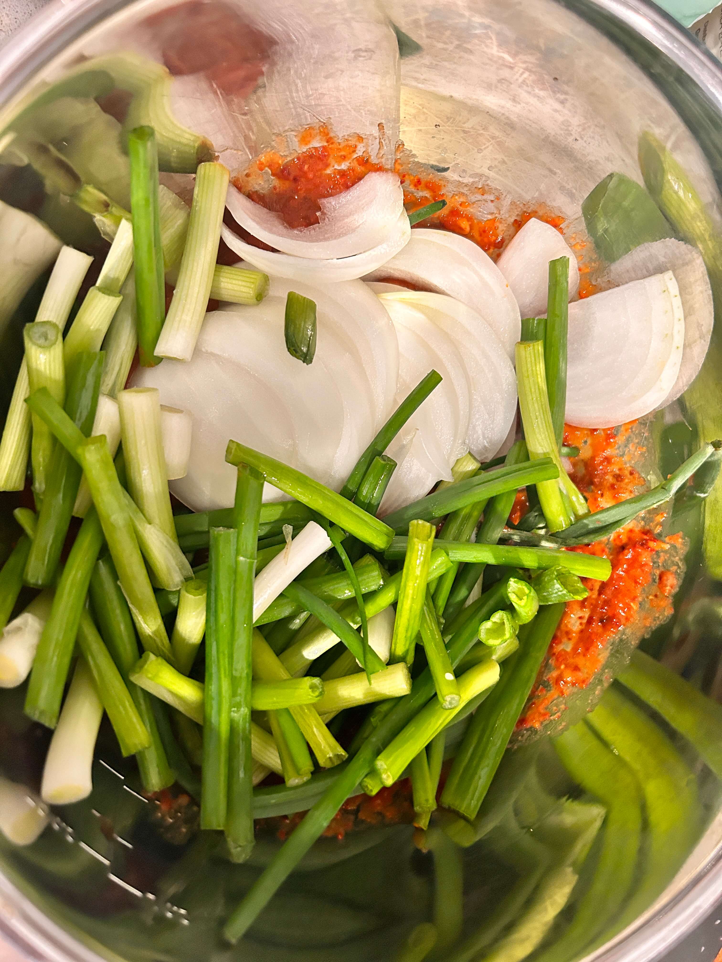 12. 속재료로 들어갈 쪽파와 양파를 썰어줍니다.