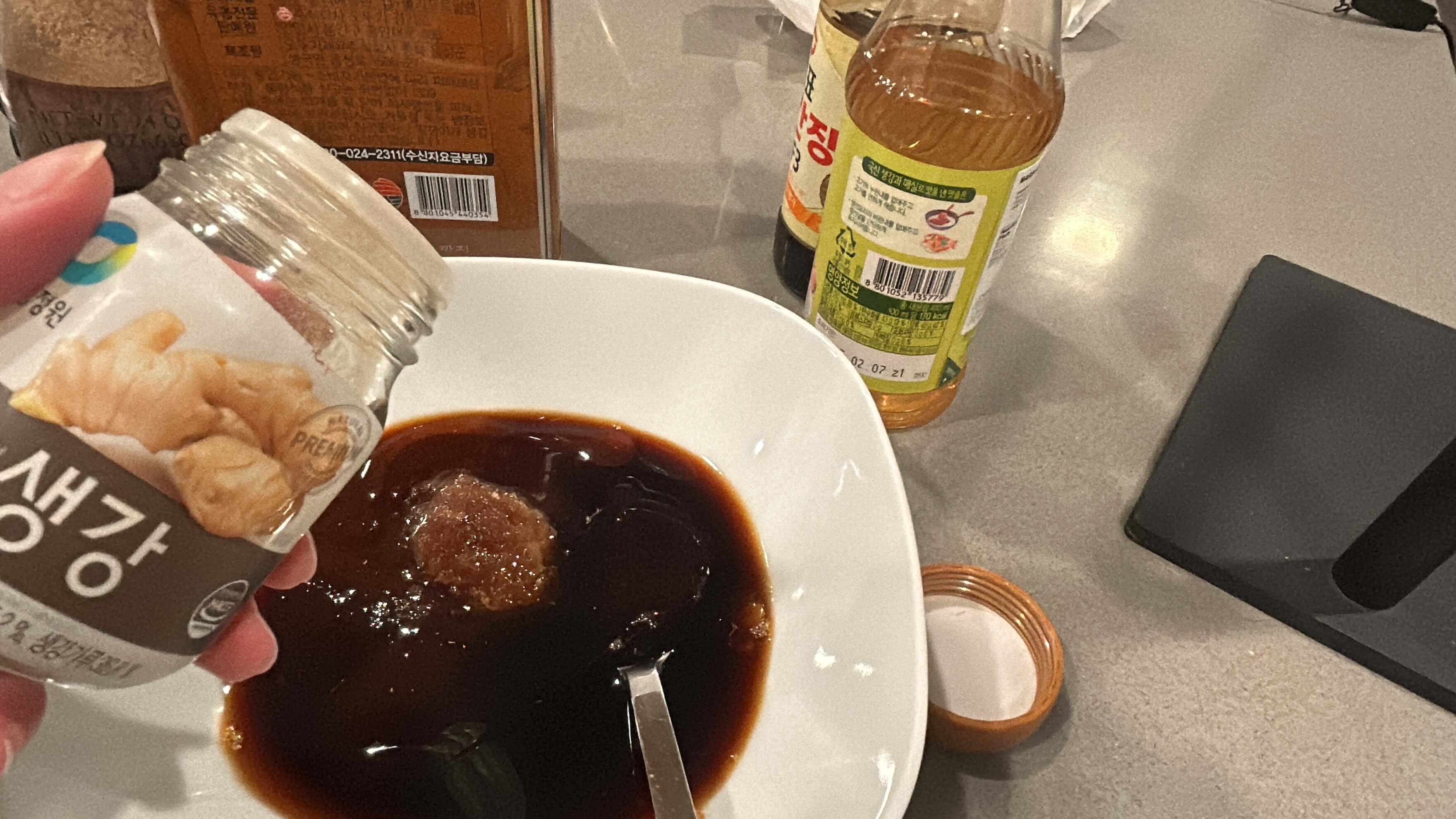 3. 다진 마늘 1 숟갈, 간장 9 숟갈, 맛술 3 숟갈, 황설탕 7숟갈, 참기름 3 숟갈, 생강가루 톡톡 넣어서 양념을 잘 섞어줍니다.