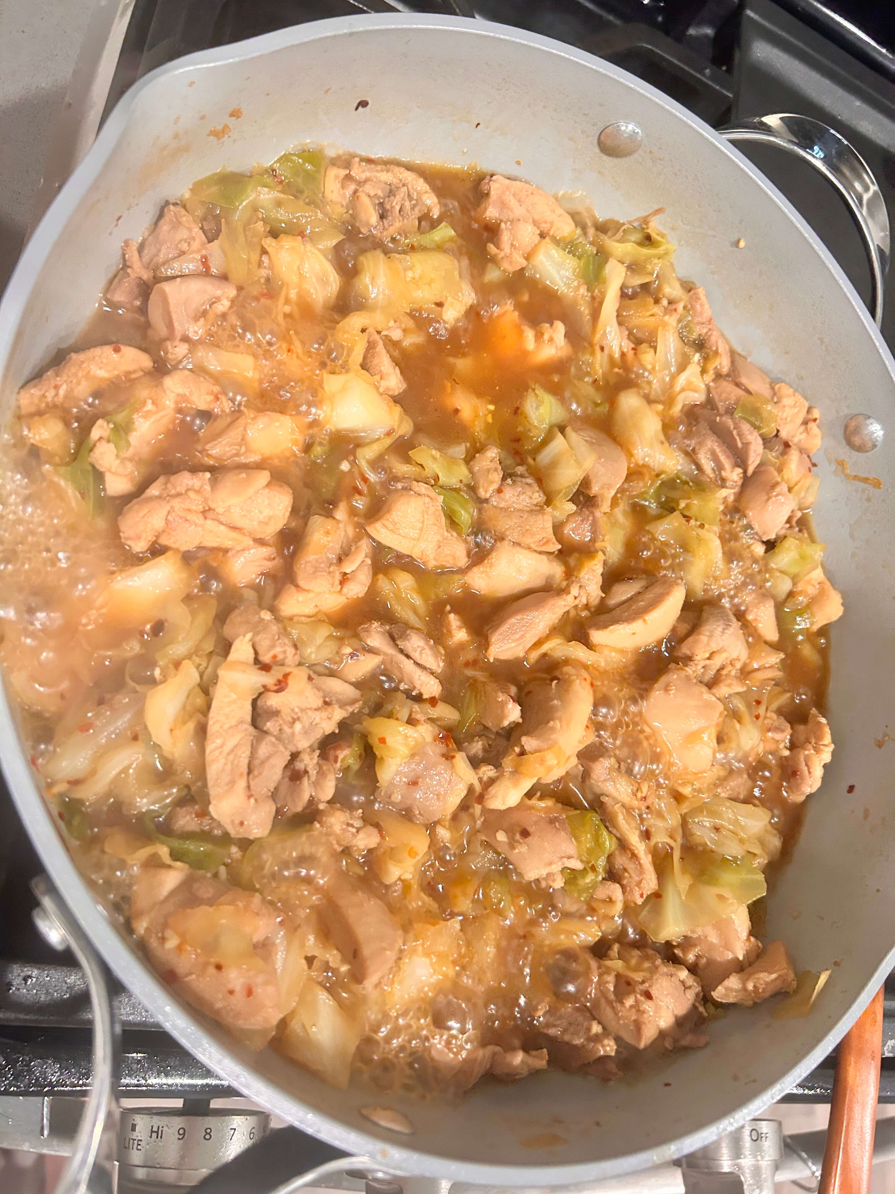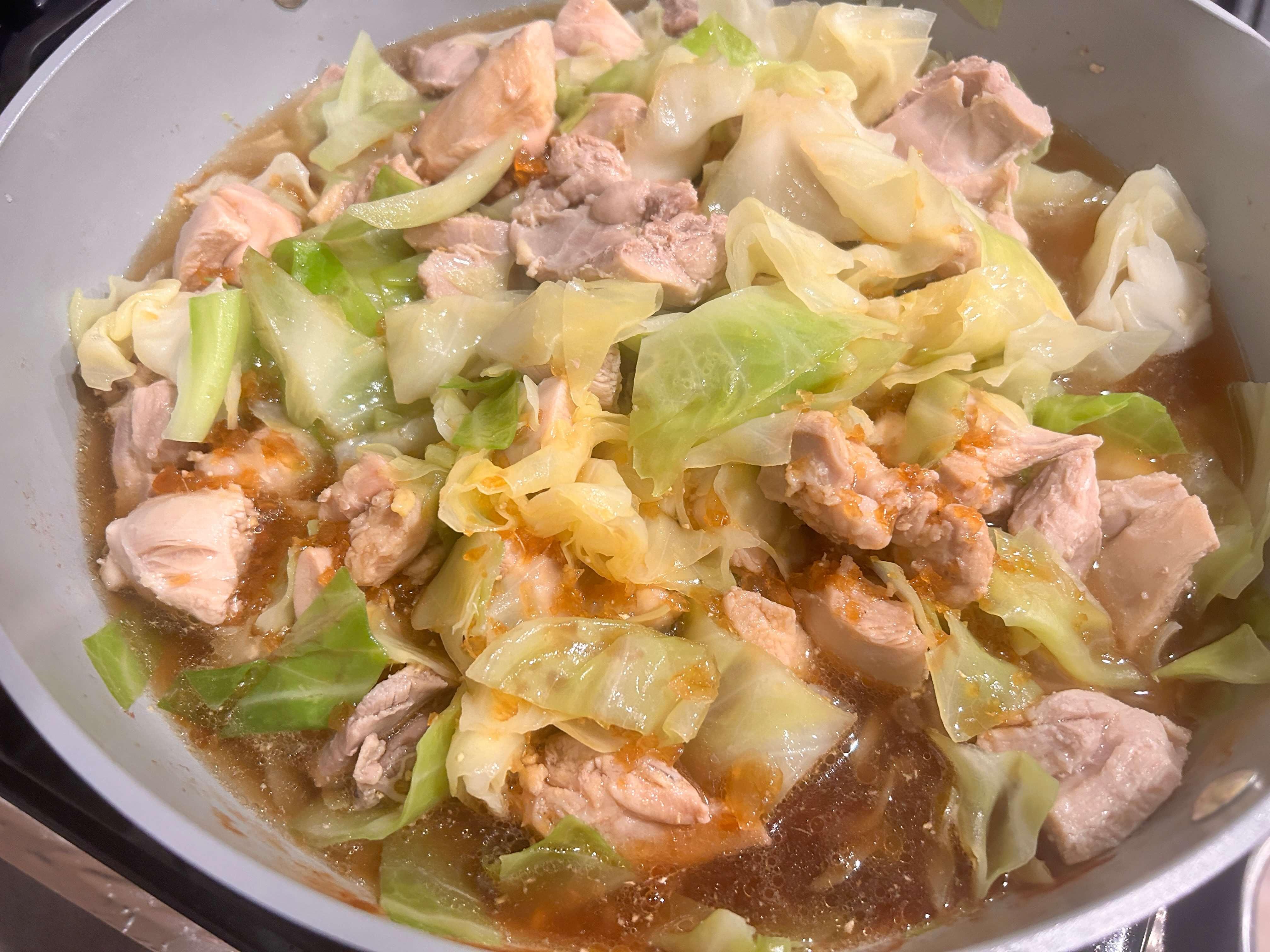7. 양배추를 넣고 닭과 함께 잘 볶아줍니다. (양배추 숨이 죽을 대까지 볶아줍니다.)