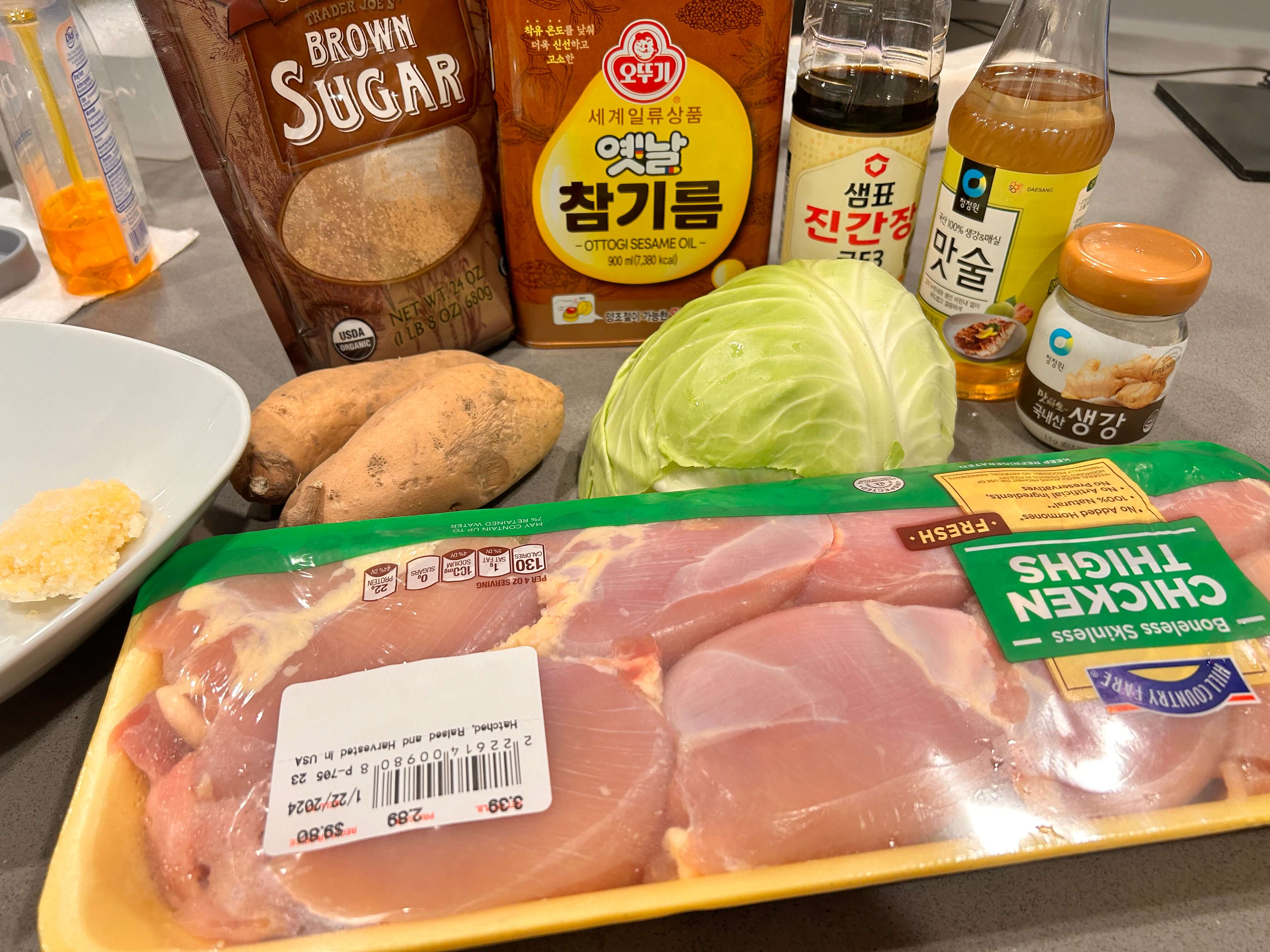 1. 닭, 고구마, 양배추, 다진 마늘, 생강가루, 간장, 황설탕, 맛술, 참기름을 준비해 줍니다.