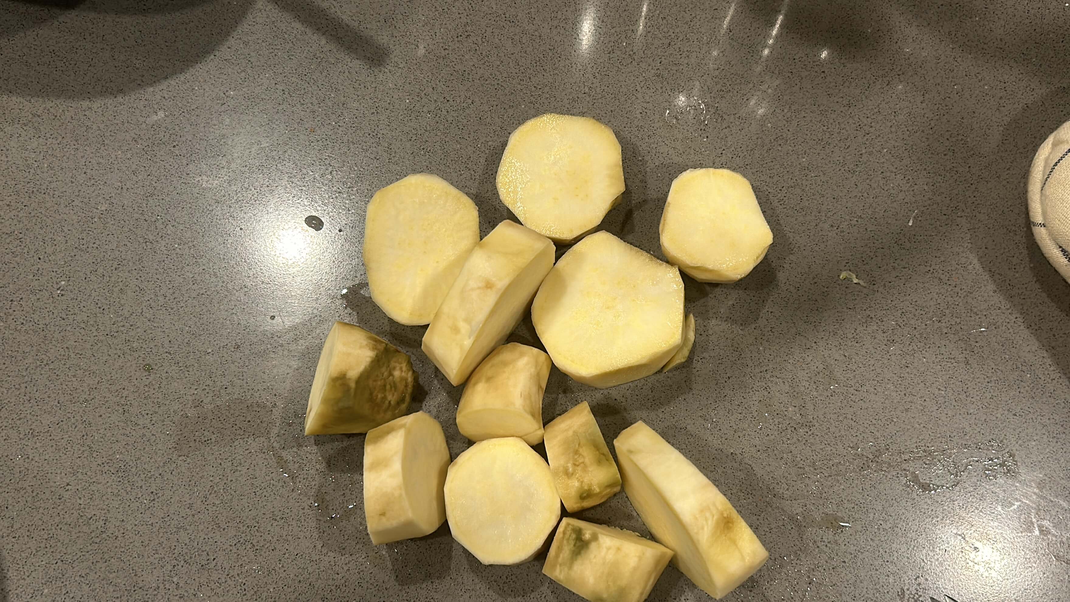 2. 고구마와 양배추는 씻은 뒤, 먹기 좋은 크기로 잘라서 준비해 줍니다.