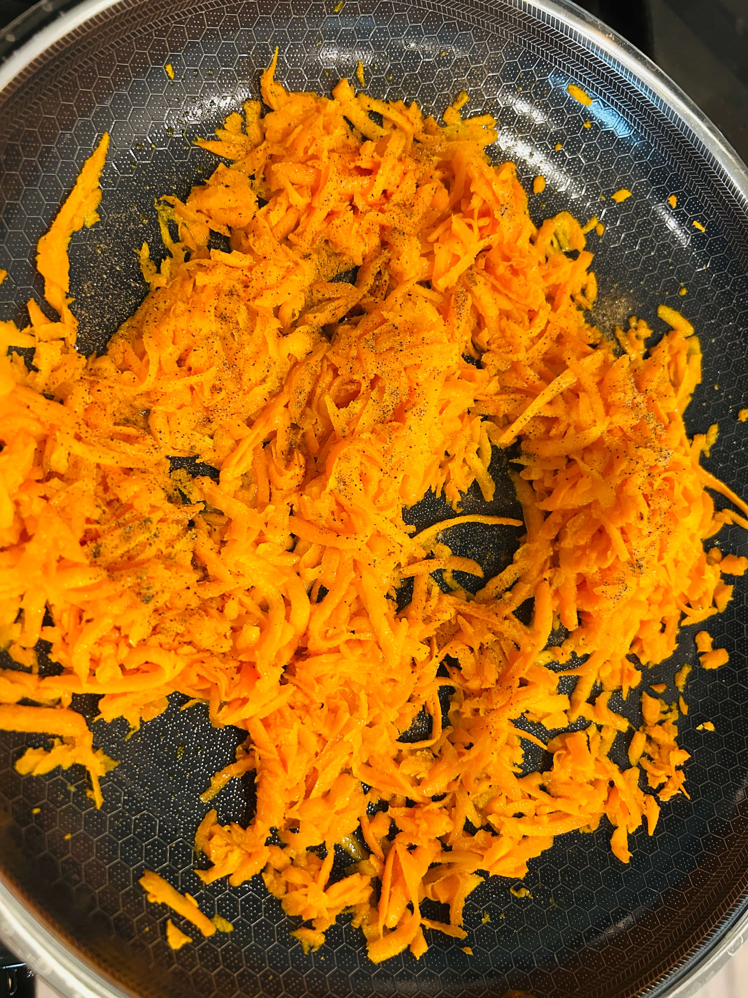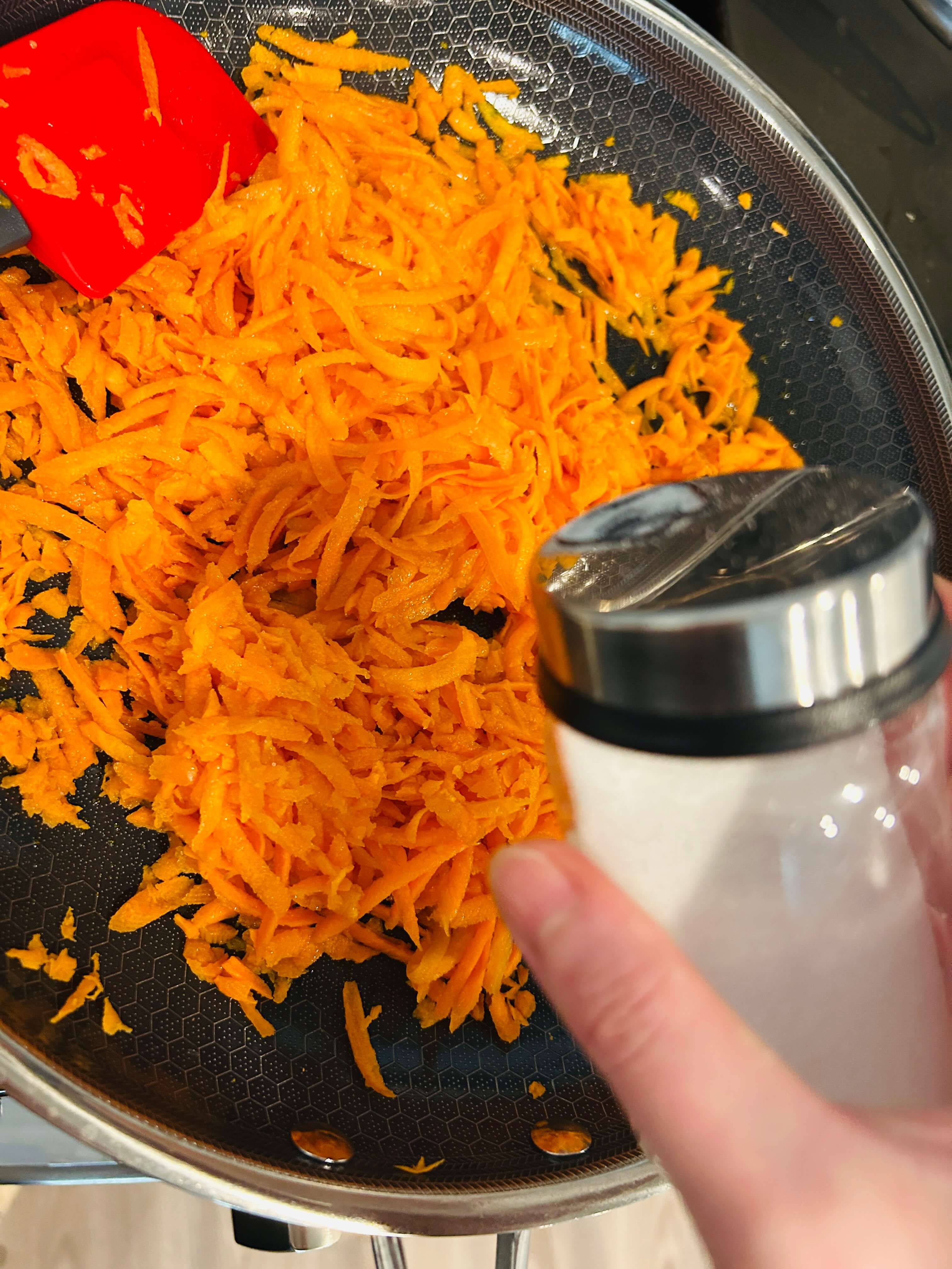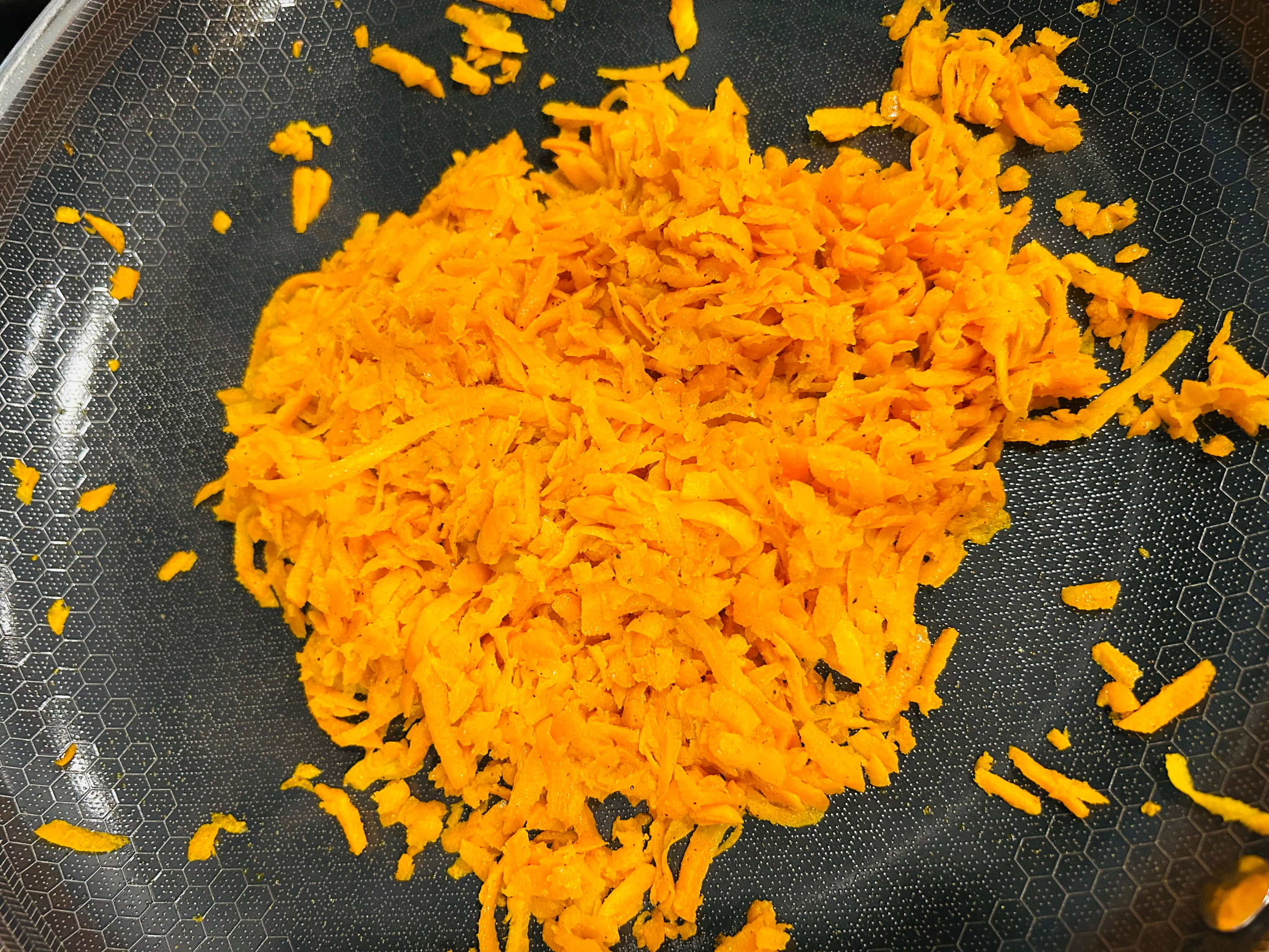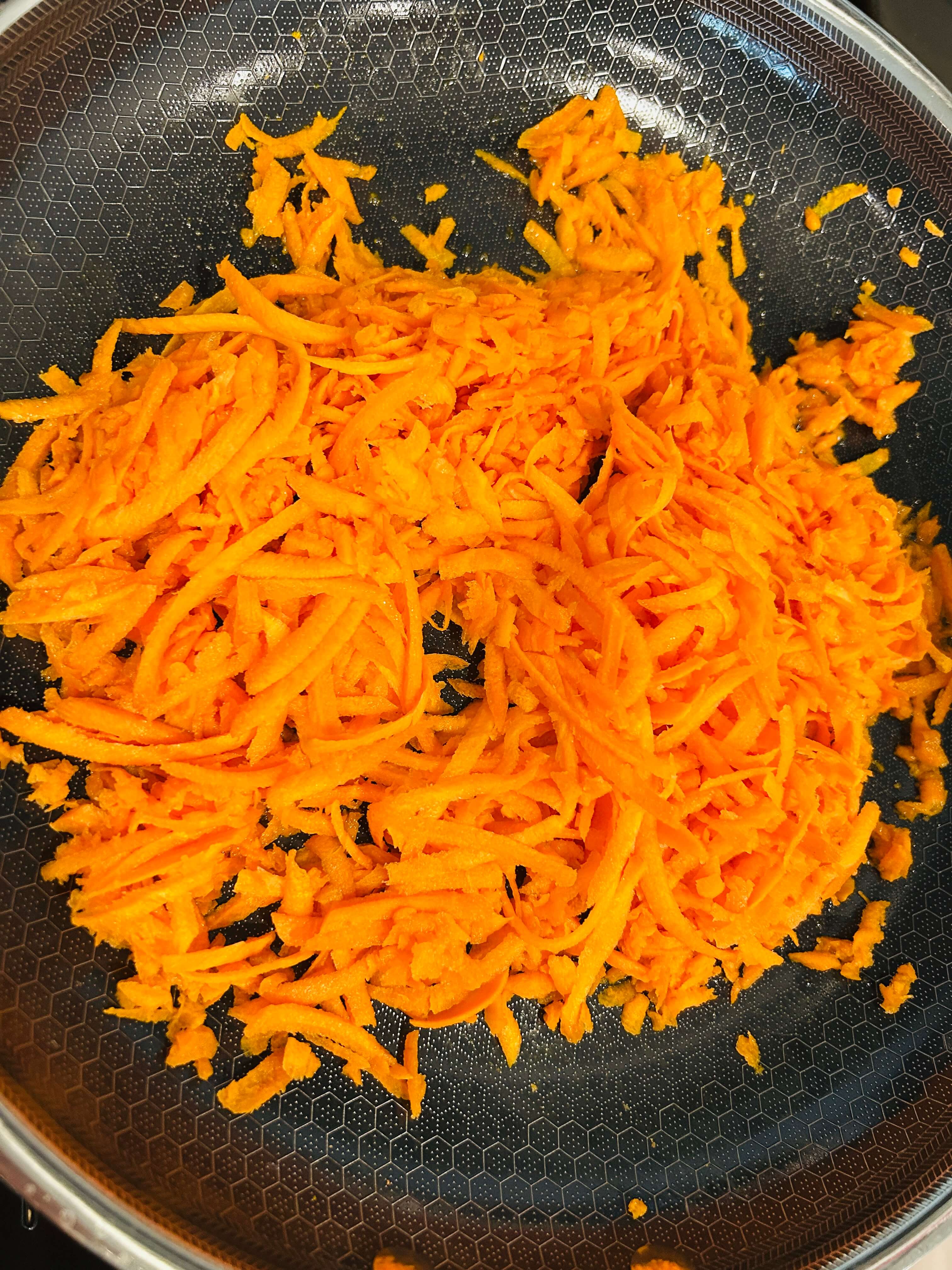 3. 팬에 올리브유를 두르고 채 썬 당근을 올려 볶아줍니다.