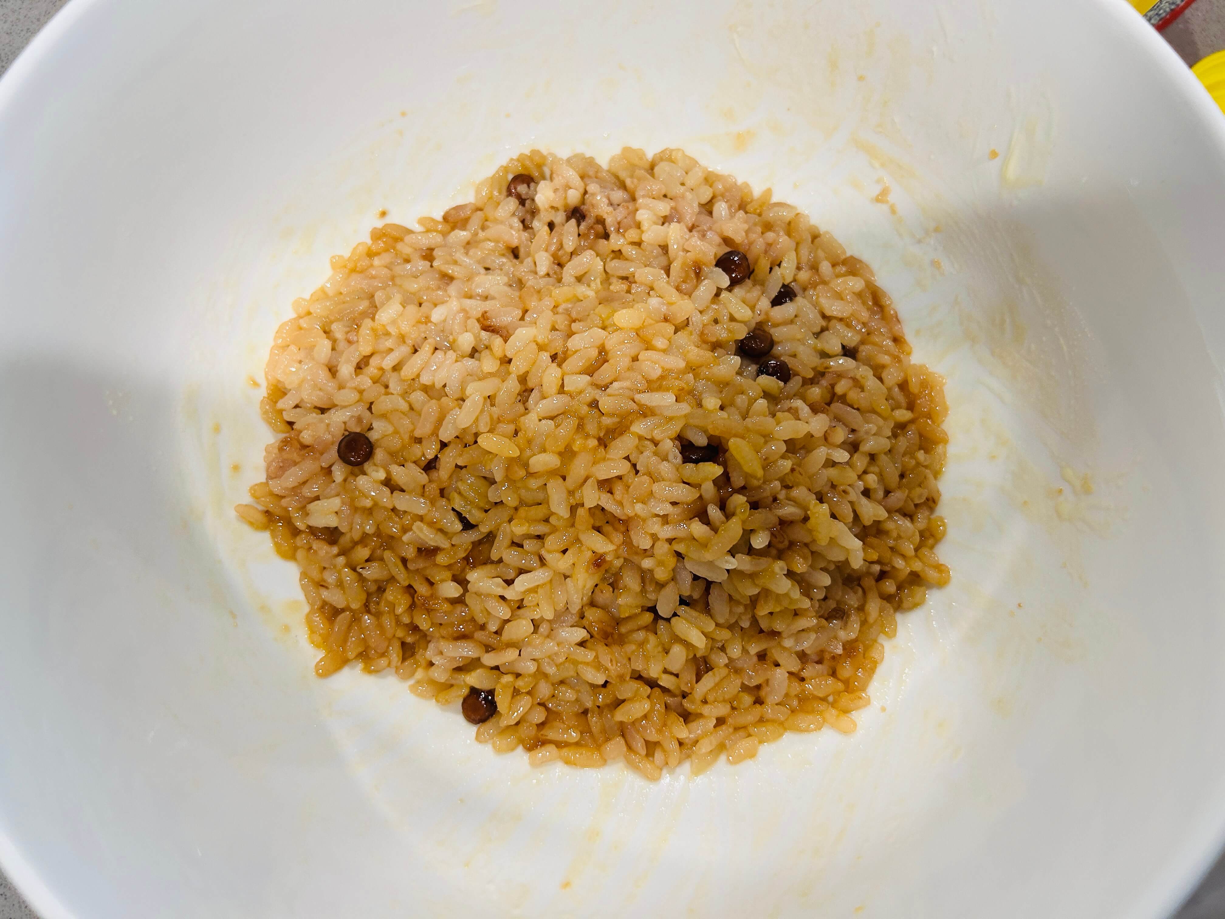 2. 밥에 버터 한 숟갈, 간장 한 숟갈을 넣고 잘 비벼줍니다.