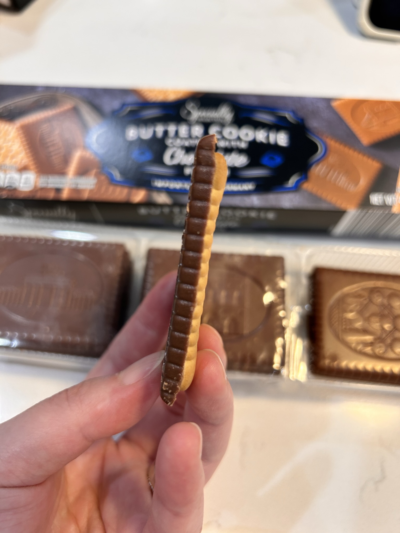 초코코팅이 되어있고 두계는 이렇습니다. 얇지도 두껍지도 않아 좋습니다.