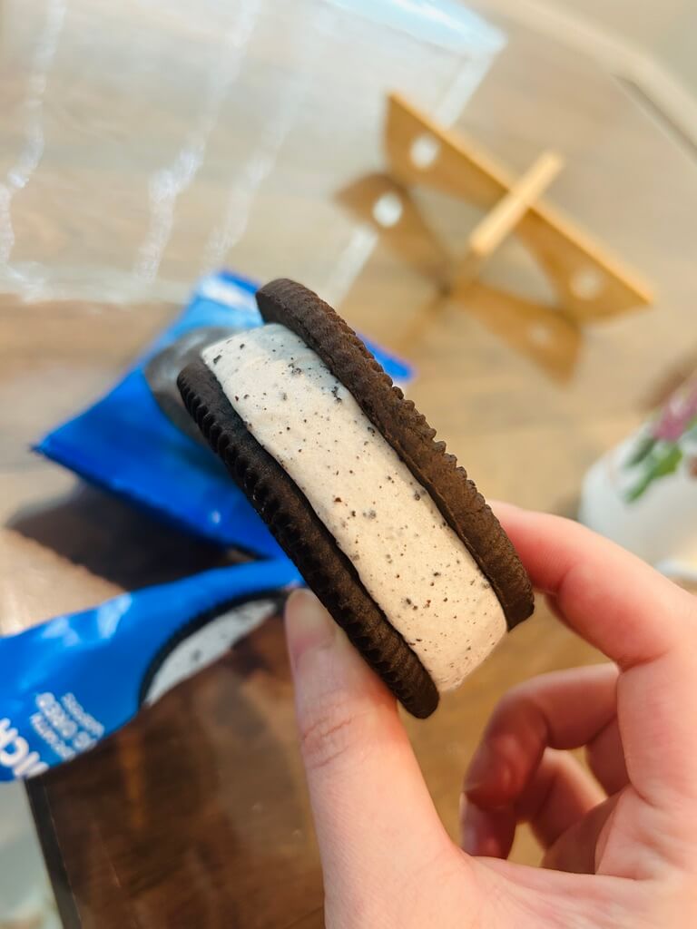 우선, 아이스크림을 감싸고 있는 오레오 겉면은 바삭하지 않고 살짝 눅눅한 식감입니다. 이 점이 호불호가 갈릴 수는 있지만, 개인적으로는 빵또아 스타일의 부드러운 샌드 느낌이 나서 좋았습니다. 빵또아를 좋아하신다면 이 제품 역시 입에 잘 맞을 확률이 높습니다.